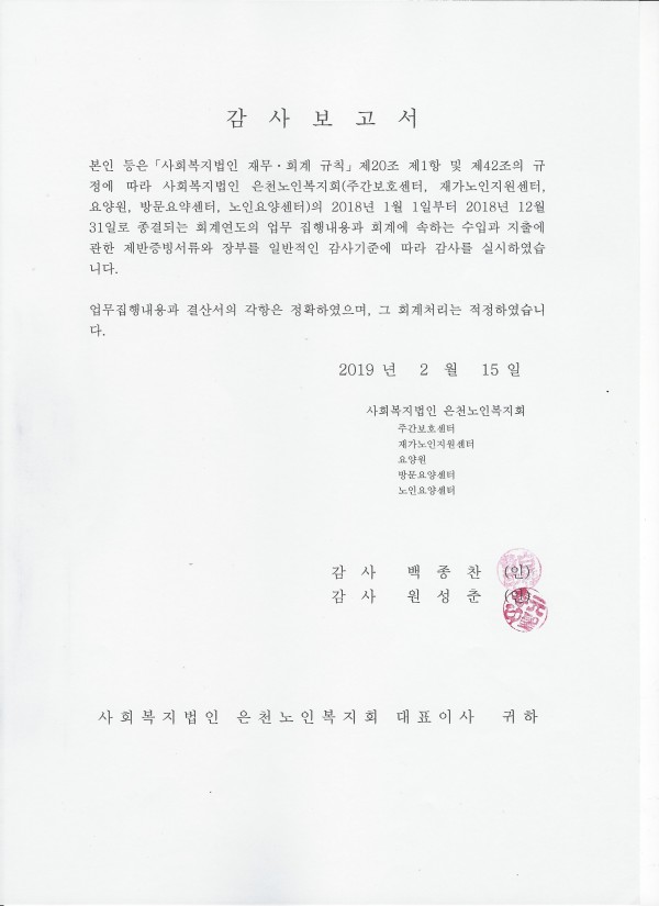 2018년 법인회계감사 보고서 페이지 정보 작성자 은천노인복지회 작성일19-02-27 14:31 조회140,656회 댓글0건 관련링크 이전글 다음글 목록 답변 본문 2018년 법인회계감사 보고서입니다. 이전글 다음글 목록 답변