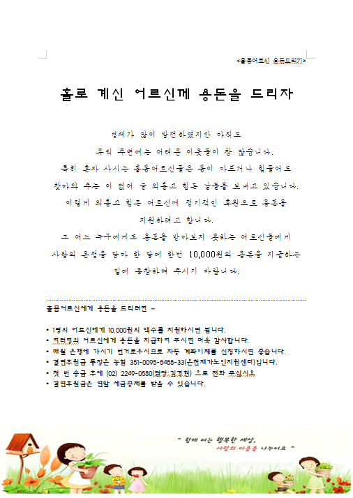 홀로계신 어르신께 용돈을 드리자 페이지 정보 작성자 은천노인복지회 작성일17-12-06 14:55 조회82,443회 댓글0건 관련링크 이전글 다음글 목록 답변 본문 홀몸 어르신께 용돈을 드리는 일에 함께 동참하여 주세요~~ 이전글 다음글 목록 답변