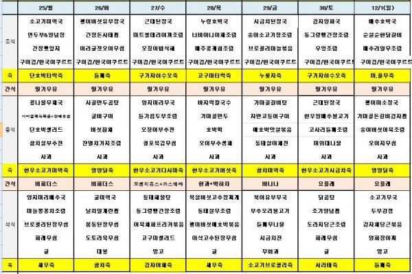 11월넷째주식단표 페이지 정보 작성자 은천노인복지회 작성일19-11-27 09:21 조회39,396회 댓글0건 관련링크 이전글 다음글 목록 답변 본문 ※ 모든 식사에는 잡곡밥과 김치가 제공됩니다. ※ 식단은 식재료수급에 의해 변경될 수 있습니다. 이전글 다음글 목록 답변