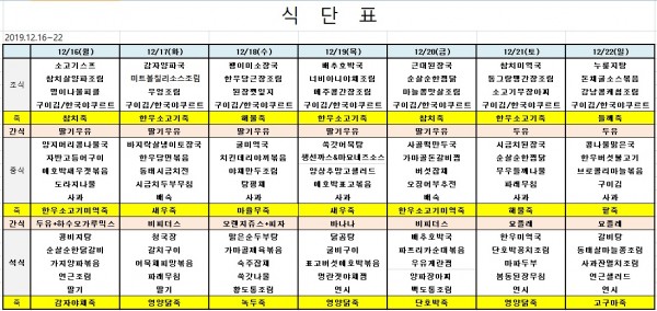 12월 셋째주 식단표 페이지 정보 작성자 은천노인복지회 작성일19-12-15 15:47 조회38,260회 댓글0건 관련링크 이전글 다음글 목록 답변 본문 ※ 모든 식사에는 잡곡밥과 김치가 제공됩니다. ※ 식단은 식재료수급에 의해 변경될 수 있습니다. 이전글 다음글 목록 답변