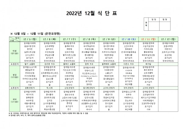 12월 첫째주 식단표 페이지 정보 작성자 은천노인복지회 작성일22-12-01 17:14 조회90,561회 댓글0건 관련링크 이전글 다음글 목록 답변 본문 . 이전글 다음글 목록 답변