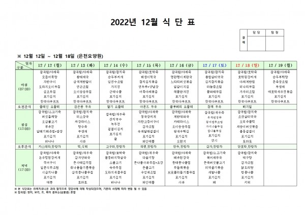 12월 둘째주 식단표 페이지 정보 작성자 은천노인복지회 작성일22-12-08 14:20 조회89,849회 댓글0건 관련링크 이전글 다음글 목록 답변 본문 . 이전글 다음글 목록 답변