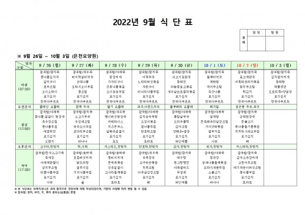 9월 다섯째주 식단표 페이지 정보 작성자 은천노인복지회 작성일22-09-22 17:36 조회96,383회 댓글0건 관련링크 이전글 다음글 목록 답변 본문 . 이전글 다음글 목록 답변