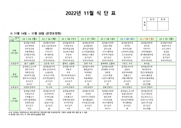11월 셋째주 식단표 페이지 정보 작성자 은천노인복지회 작성일22-11-10 10:10 조회92,182회 댓글0건 관련링크 이전글 다음글 목록 답변 본문 . 이전글 다음글 목록 답변