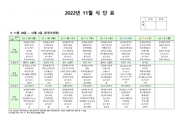 11월 넷째주 식단표 페이지 정보 작성자 은천노인복지회 작성일22-11-24 16:56 조회91,901회 댓글0건 관련링크 이전글 다음글 목록 답변 본문 . 이전글 다음글 목록 답변