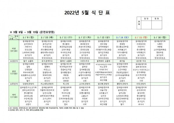 5월 둘째주 식단표 페이지 정보 작성자 은천노인복지회 작성일22-05-06 10:04 조회107,543회 댓글0건 관련링크 이전글 다음글 목록 답변 본문 . 이전글 다음글 목록 답변