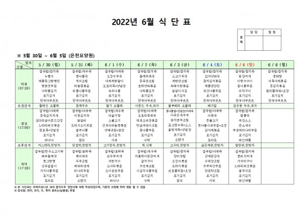 6월 첫째주 식단표 페이지 정보 작성자 은천노인복지회 작성일22-05-27 13:50 조회104,837회 댓글0건 관련링크 이전글 다음글 목록 답변 본문 . 이전글 다음글 목록 답변