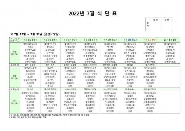 7월 넷째주 식단표 페이지 정보 작성자 은천노인복지회 작성일22-07-21 17:04 조회102,389회 댓글0건 관련링크 이전글 다음글 목록 답변 본문 . 이전글 다음글 목록 답변