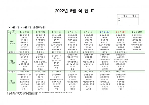 8월 첫째주 식단표 페이지 정보 작성자 은천노인복지회 작성일22-08-01 13:36 조회101,639회 댓글0건 관련링크 이전글 다음글 목록 답변 본문 . 이전글 다음글 목록 답변