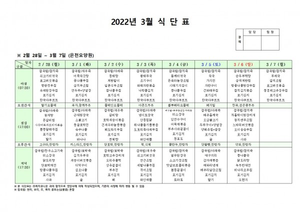 3월 첫째주 식단표 페이지 정보 작성자 은천노인복지회 작성일22-02-25 09:22 조회117,044회 댓글0건 관련링크 이전글 다음글 목록 답변 본문 . 이전글 다음글 목록 답변
