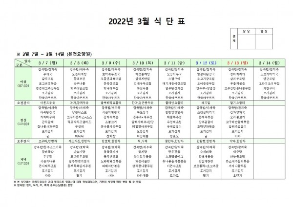 3월 둘째주 식단표 페이지 정보 작성자 은천노인복지회 작성일22-03-04 09:58 조회115,103회 댓글0건 관련링크 이전글 다음글 목록 답변 본문 . 이전글 다음글 목록 답변