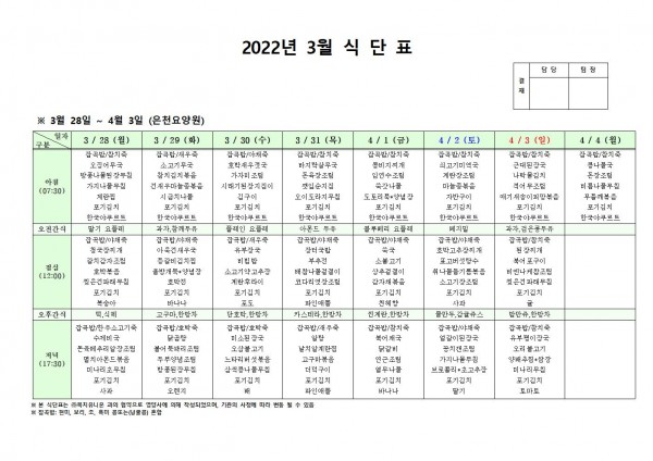 3월 다섯째주 식단표 페이지 정보 작성자 은천노인복지회 작성일22-03-25 10:40 조회113,504회 댓글0건 관련링크 이전글 다음글 목록 답변 본문 . 이전글 다음글 목록 답변