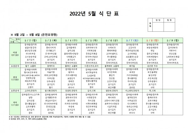 5월 첫째주 식단표 페이지 정보 작성자 은천노인복지회 작성일22-04-29 10:35 조회108,738회 댓글0건 관련링크 이전글 다음글 목록 답변 본문 . 이전글 다음글 목록 답변