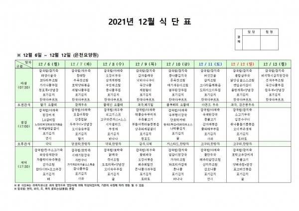 12월 둘째주 식단표 페이지 정보 작성자 은천노인복지회 작성일21-12-03 10:52 조회123,911회 댓글0건 관련링크 이전글 다음글 목록 답변 본문 . 이전글 다음글 목록 답변