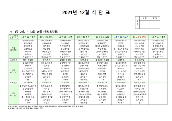 12월 넷째주 식단표 페이지 정보 작성자 은천노인복지회 작성일21-12-16 17:24 조회122,743회 댓글0건 관련링크 이전글 다음글 목록 답변 본문 . 이전글 다음글 목록 답변