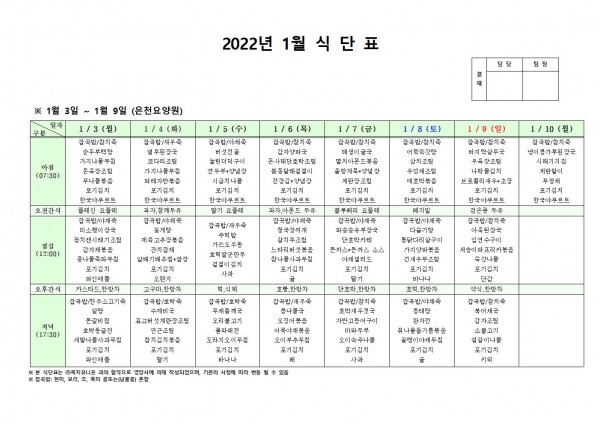 2022년 1월 첫째주 식단표 페이지 정보 작성자 은천노인복지회 작성일21-12-30 17:37 조회122,411회 댓글0건 관련링크 이전글 다음글 목록 답변 본문 . 이전글 다음글 목록 답변