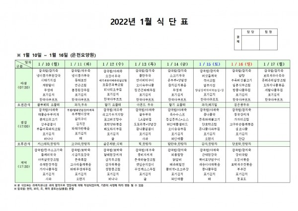 1월 둘째주 식단표 페이지 정보 작성자 은천노인복지회 작성일22-01-07 10:03 조회121,849회 댓글0건 관련링크 이전글 다음글 목록 답변 본문 . 이전글 다음글 목록 답변