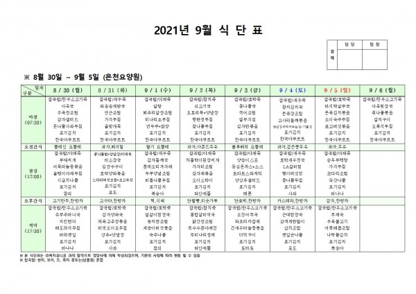 9월 첫째주 식단표 페이지 정보 작성자 은천노인복지회 작성일21-08-26 17:14 조회129,466회 댓글0건 관련링크 이전글 다음글 목록 답변 본문 . 이전글 다음글 목록 답변