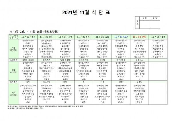 11월 넷째주 식단표 페이지 정보 작성자 은천노인복지회 작성일21-11-25 17:12 조회125,847회 댓글0건 관련링크 이전글 다음글 목록 답변 본문 . 이전글 다음글 목록 답변