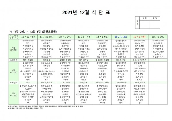 12월 첫째주 식단표 페이지 정보 작성자 은천노인복지회 작성일21-11-25 17:12 조회125,172회 댓글0건 관련링크 이전글 다음글 목록 답변 본문 . 이전글 다음글 목록 답변