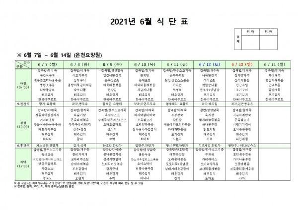 6월 둘째주 식단표 페이지 정보 작성자 은천노인복지회 작성일21-06-03 17:20 조회135,101회 댓글0건 관련링크 이전글 다음글 목록 답변 본문 . 이전글 다음글 목록 답변