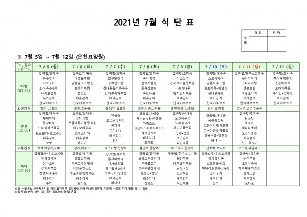 7월 첫째주 식단표 페이지 정보 작성자 은천노인복지회 작성일21-07-02 16:57 조회134,508회 댓글0건 관련링크 이전글 다음글 목록 답변 본문 . 이전글 다음글 목록 답변