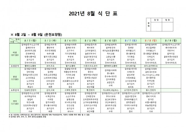 8월 첫째주 식단표 페이지 정보 작성자 은천노인복지회 작성일21-08-05 10:26 조회132,237회 댓글0건 관련링크 이전글 다음글 목록 답변 본문 . 이전글 다음글 목록 답변