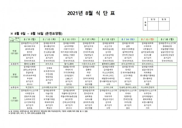 8월 둘째주 식단표 페이지 정보 작성자 은천노인복지회 작성일21-08-12 15:05 조회132,313회 댓글0건 관련링크 이전글 다음글 목록 답변 본문 . 이전글 다음글 목록 답변