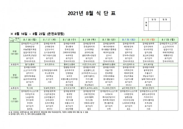 8월 셋째주 식단표 페이지 정보 작성자 은천노인복지회 작성일21-08-12 17:43 조회131,294회 댓글0건 관련링크 이전글 다음글 목록 답변 본문 . 이전글 다음글 목록 답변