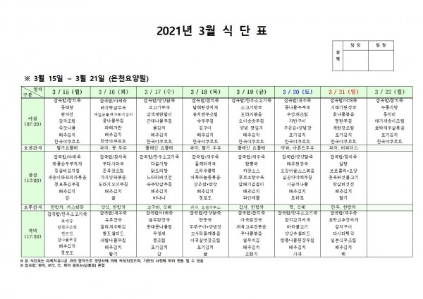 3월 셋째주 식단표 페이지 정보 작성자 은천노인복지회 작성일21-03-12 11:41 조회144,253회 댓글0건 관련링크 이전글 다음글 목록 답변 본문 3월 셋째주 식단표[이 게시물은 은천노인복지회님에 의해 2021-03-12 17:18:24 공지사항에서 이동 됨] 이전글 다음글 목록 답변