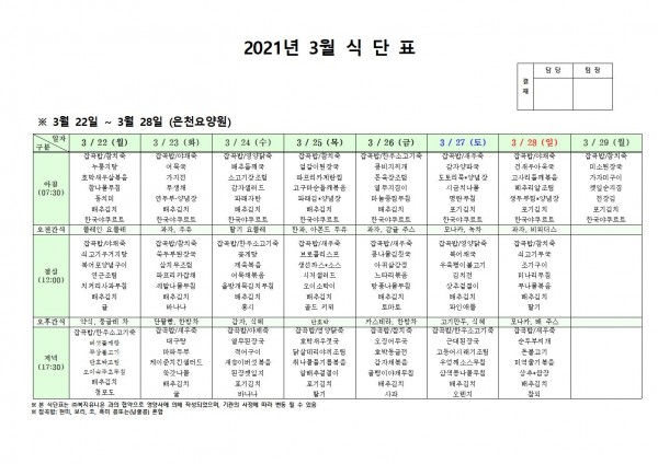 3월 넷째주 식단표 페이지 정보 작성자 은천노인복지회 작성일21-03-18 17:41 조회143,992회 댓글0건 관련링크 이전글 다음글 목록 답변 본문 3월 넷째주 식단표 이전글 다음글 목록 답변