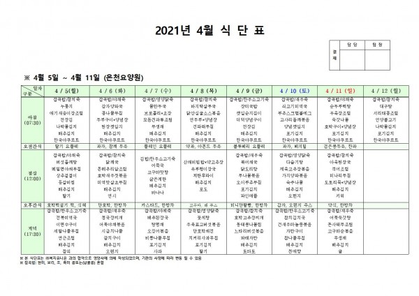 4월 첫째주 식단표 페이지 정보 작성자 은천노인복지회 작성일21-04-01 18:24 조회142,006회 댓글0건 관련링크 이전글 다음글 목록 답변 본문 4월 첫째주 식단표 이전글 다음글 목록 답변