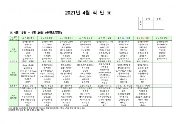 4월 셋째주 식단표 페이지 정보 작성자 은천노인복지회 작성일21-04-15 19:35 조회140,779회 댓글0건 관련링크 이전글 다음글 목록 답변 본문 4월 셋째주 식단표 이전글 다음글 목록 답변