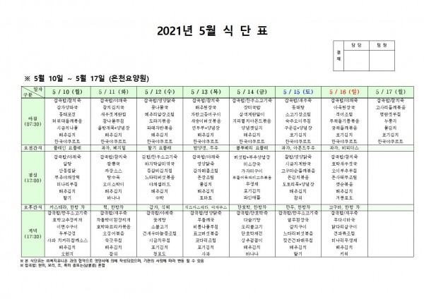 5월 둘째주 식단표 페이지 정보 작성자 은천노인복지회 작성일21-05-06 22:23 조회137,942회 댓글0건 관련링크 이전글 다음글 목록 답변 본문 5월 둘째주 식단표 이전글 다음글 목록 답변