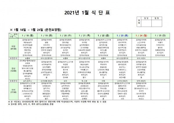 1월 셋째주 식단표 페이지 정보 작성자 은천노인복지회 작성일21-01-15 10:02 조회148,642회 댓글0건 관련링크 이전글 다음글 목록 답변 본문 . 이전글 다음글 목록 답변