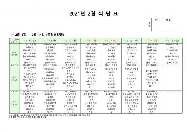 2월 둘째주 식단표 페이지 정보 작성자 은천노인복지회 작성일21-02-04 17:45 조회148,326회 댓글0건 관련링크 이전글 다음글 목록 답변 본문 . 이전글 다음글 목록 답변