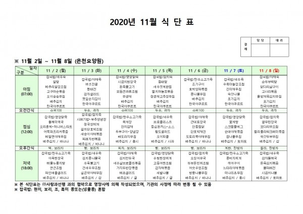 11월 첫째주 식단표 페이지 정보 작성자 은천노인복지회 작성일20-11-13 13:47 조회157,025회 댓글0건 관련링크 이전글 다음글 목록 답변 본문 . 이전글 다음글 목록 답변