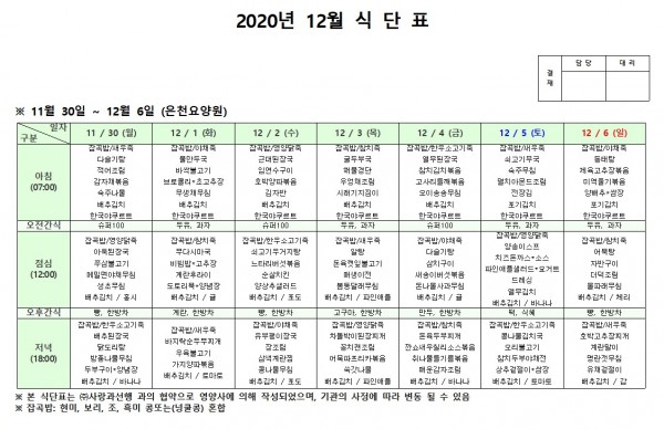 12월 첫째주 식단표 페이지 정보 작성자 은천노인복지회 작성일20-12-08 18:10 조회154,265회 댓글0건 관련링크 이전글 다음글 목록 답변 본문 . 이전글 다음글 목록 답변