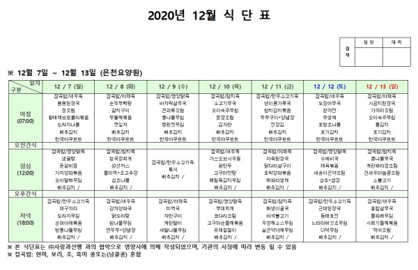 12월 둘째주 식단표 페이지 정보 작성자 은천노인복지회 작성일20-12-08 18:11 조회154,091회 댓글0건 관련링크 이전글 다음글 목록 답변 본문 . 이전글 다음글 목록 답변