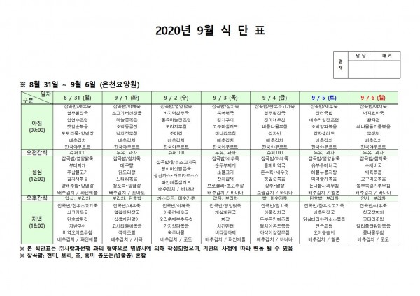 9월 첫째주 식단표 페이지 정보 작성자 은천노인복지회 작성일20-09-07 14:40 조회163,109회 댓글0건 관련링크 이전글 다음글 목록 답변 본문 * 이전글 다음글 목록 답변
