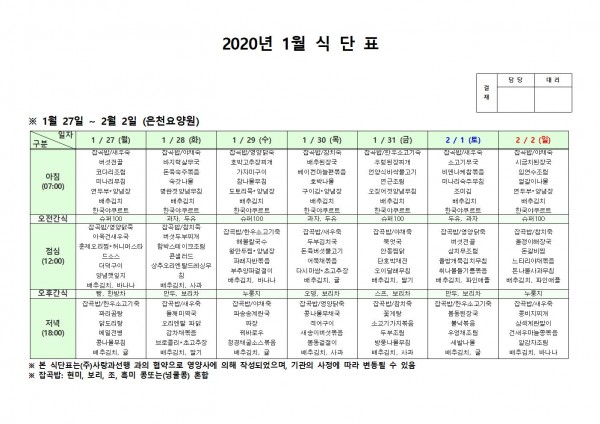 1월 넷째주 식단표 페이지 정보 작성자 은천노인복지회 작성일20-02-04 09:37 조회184,568회 댓글0건 관련링크 이전글 다음글 목록 답변 본문 1월 넷째주 식단표입니다. 이전글 다음글 목록 답변