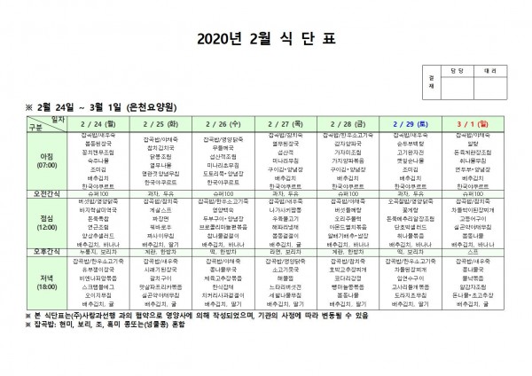 2월 넷째주 식단표 페이지 정보 작성자 은천노인복지회 작성일20-03-02 13:41 조회180,382회 댓글0건 관련링크 이전글 다음글 목록 답변 본문 2월 넷째주 식단표입니다 이전글 다음글 목록 답변