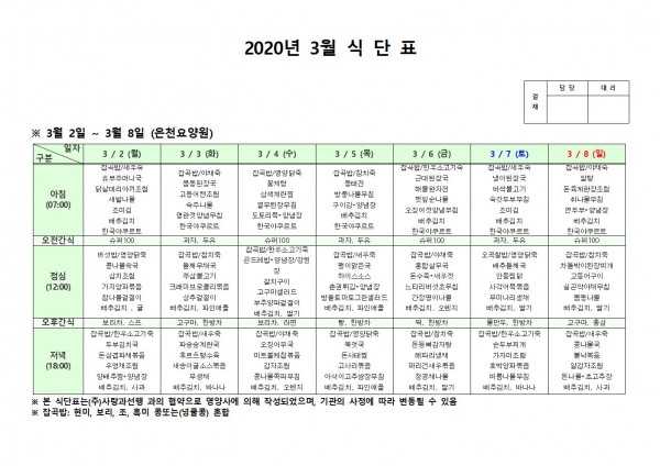 3월 첫째주 식단표 페이지 정보 작성자 은천노인복지회 작성일20-03-09 11:55 조회180,399회 댓글0건 관련링크 이전글 다음글 목록 답변 본문 . 이전글 다음글 목록 답변