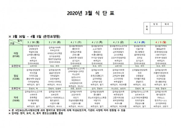 3월 다섯째주 식단표 페이지 정보 작성자 은천노인복지회 작성일20-04-06 14:47 조회179,327회 댓글0건 관련링크 이전글 다음글 목록 답변 본문 . 이전글 다음글 목록 답변