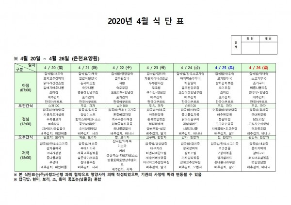 4월 셋째주 식단표 페이지 정보 작성자 은천노인복지회 작성일20-04-27 16:31 조회176,254회 댓글0건 관련링크 이전글 다음글 목록 답변 본문 . 이전글 다음글 목록 답변