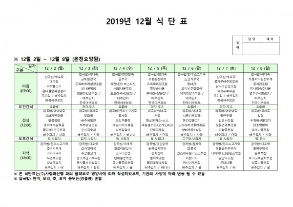 12월 첫째주 식단표 페이지 정보 작성자 은천노인복지회 작성일19-12-11 09:51 조회189,817회 댓글0건 관련링크 이전글 다음글 목록 답변 본문 12월 첫째주 식단표 이전글 다음글 목록 답변