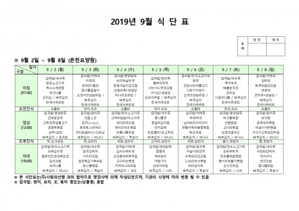 9월 첫째주 식단표 페이지 정보 작성자 은천노인복지회 작성일19-09-09 14:48 조회197,182회 댓글0건 관련링크 이전글 다음글 목록 답변 본문 9월 첫째주 식단표 이전글 다음글 목록 답변