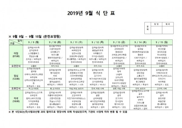 9월 둘째주 식단표 페이지 정보 작성자 은천노인복지회 작성일19-09-23 13:26 조회197,055회 댓글0건 관련링크 이전글 다음글 목록 답변 본문 . 이전글 다음글 목록 답변