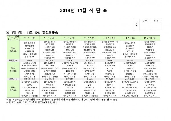 11월 첫째주 식단표 페이지 정보 작성자 은천노인복지회 작성일19-11-12 14:17 조회193,210회 댓글0건 관련링크 이전글 다음글 목록 답변 본문 11월 첫째주 식단표 이전글 다음글 목록 답변