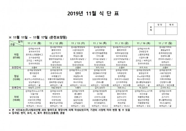 11월 둘째주 식단표 페이지 정보 작성자 은천노인복지회 작성일19-11-18 14:46 조회193,491회 댓글0건 관련링크 이전글 다음글 목록 답변 본문 11월 둘째주 식단표 이전글 다음글 목록 답변